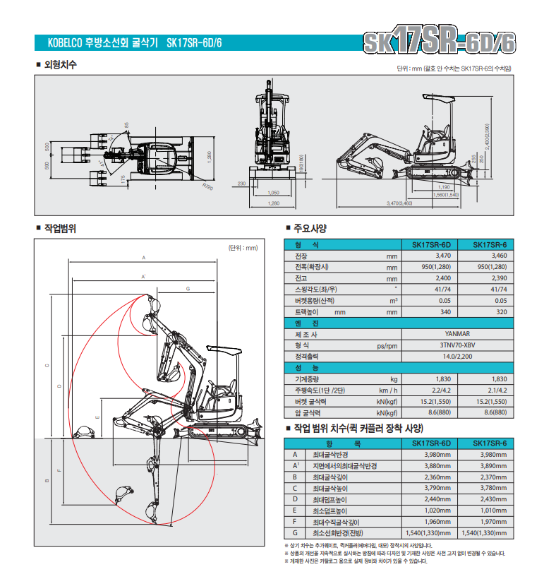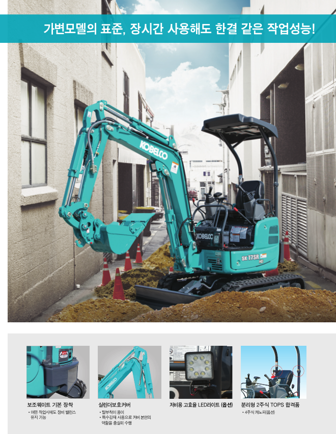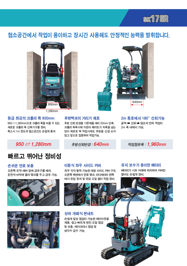 SK17SR-6/6D 브랜드 : 코벨코 - 좁은 공간에도 진입이 가능한 가변형 굴삭기(전폭 950mm<->1,280mm) - 2m폭 내에서 180도 선회 가능 - 충격에 강한 정품 실린더 보호커버 - 탈부착이 용이한 2주식 캐노피 - 작업 안정성을 높여주는 추가 웨이트 장착